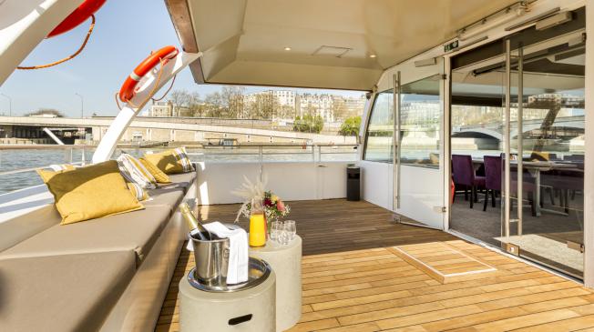Dès que vous montez à bord du Saphyr, vous êtes accueilli par un intérieur raffiné et soigneusement décoré. Les espaces sont agencés avec goût, offrant une combinaison harmonieuse de modernité et de touches classiques. Les larges baies vitrées permettent à la lumière naturelle de se répandre dans chaque recoin, offrant une vue panoramique imprenable sur les monuments emblématiques de Paris.